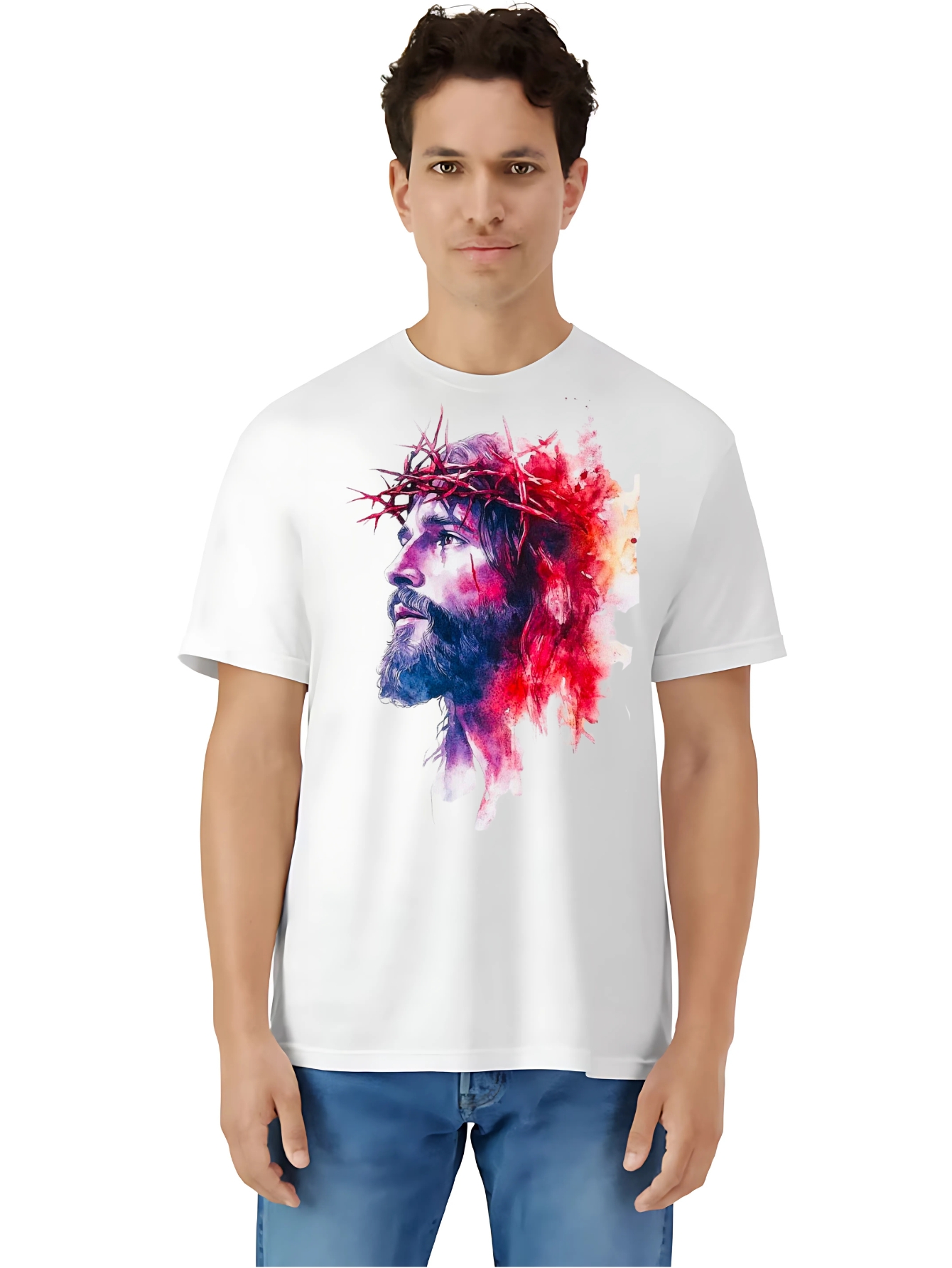Camiseta Unisex de Algodón Blanco con Estampado de Jesús y Resaltado Magenta
